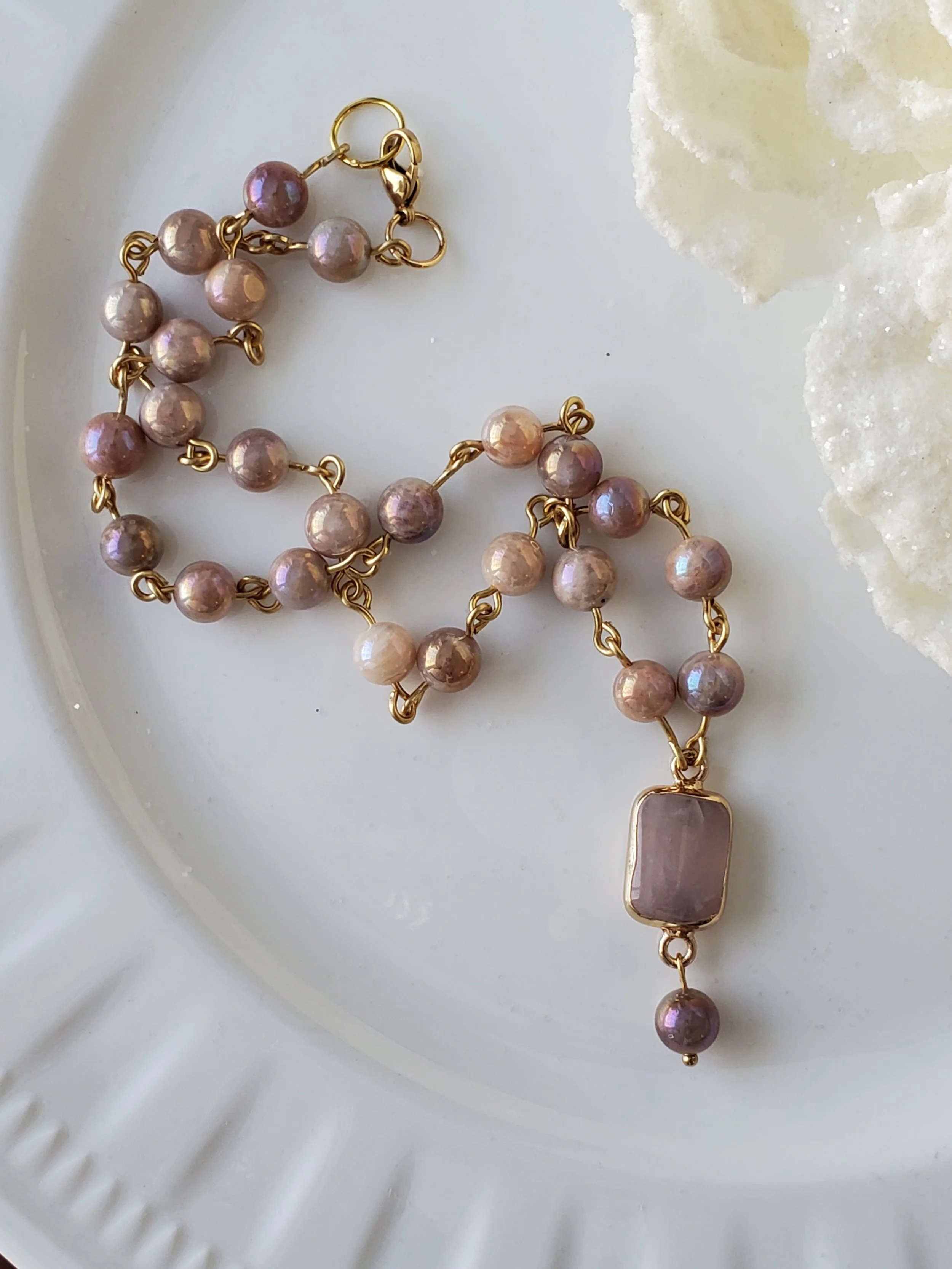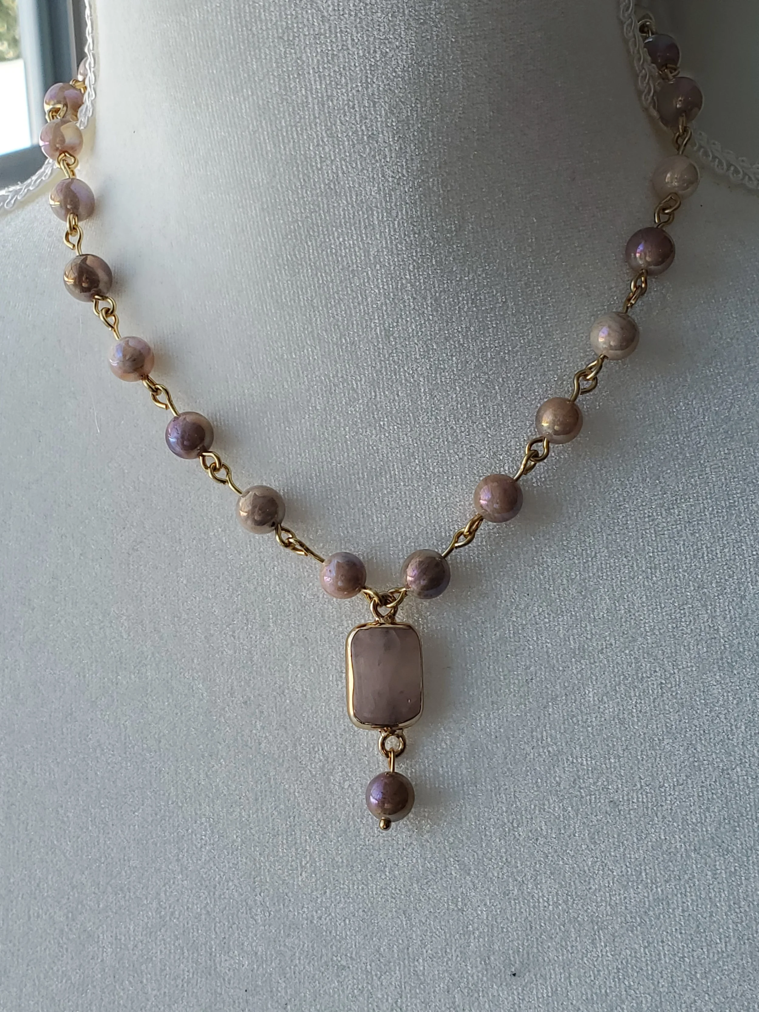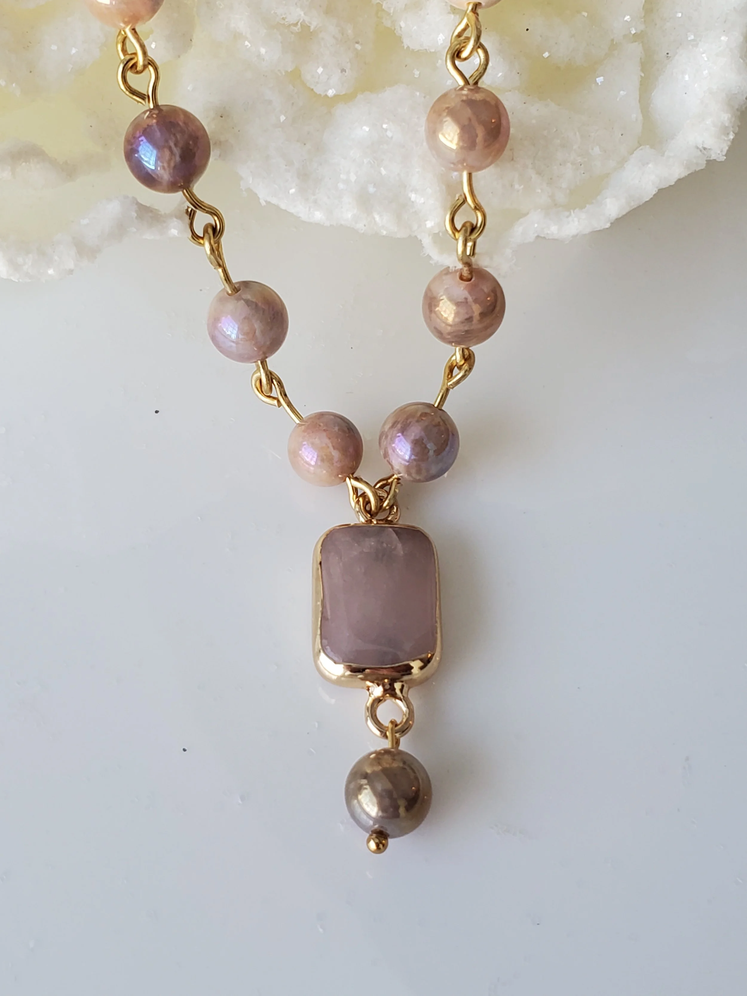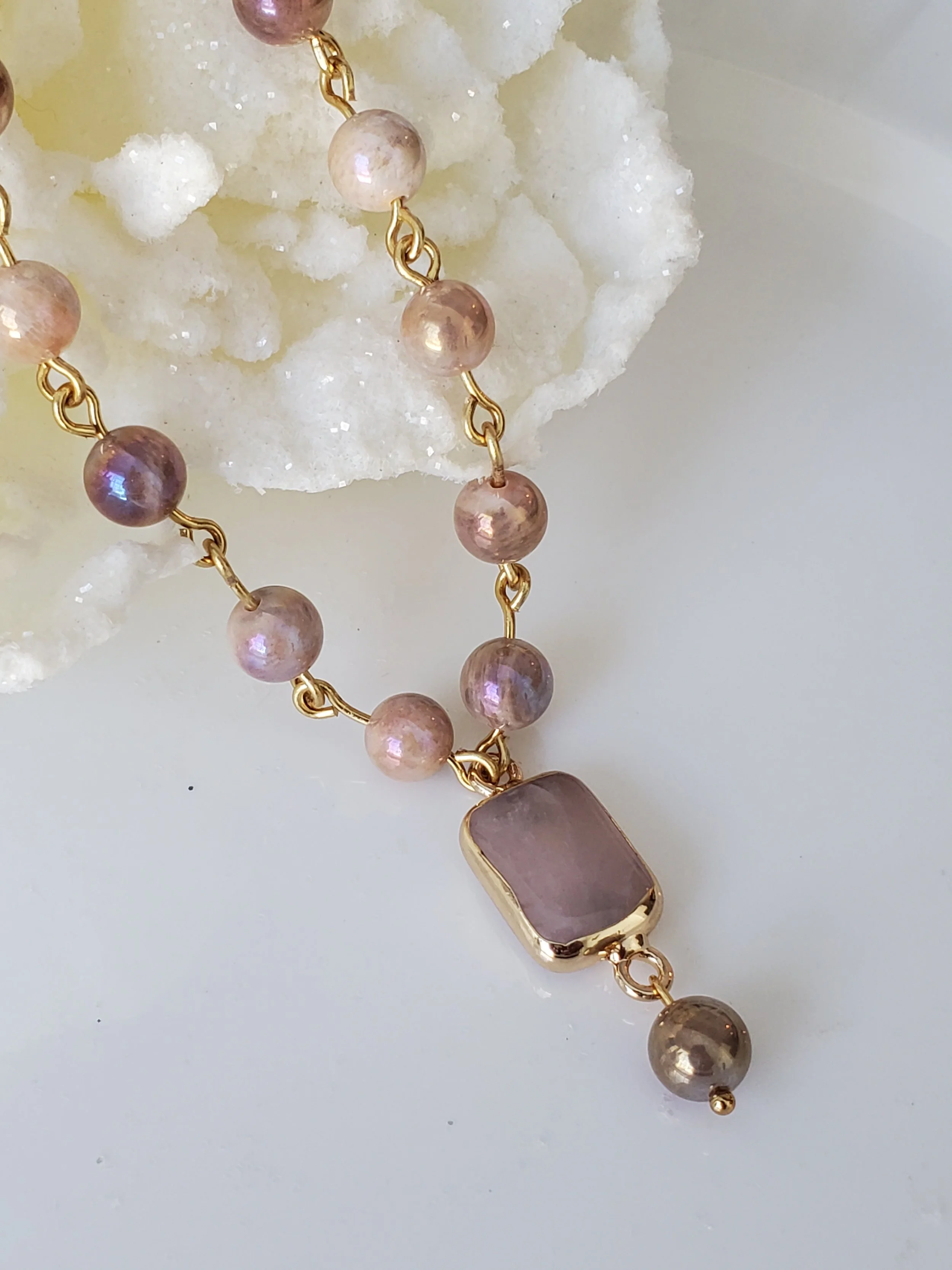 Gorgeous moonstone in shades of mauve and peach with an eye catching, show stopper rectangle pendant drop. She is subtle, yet stunning.
