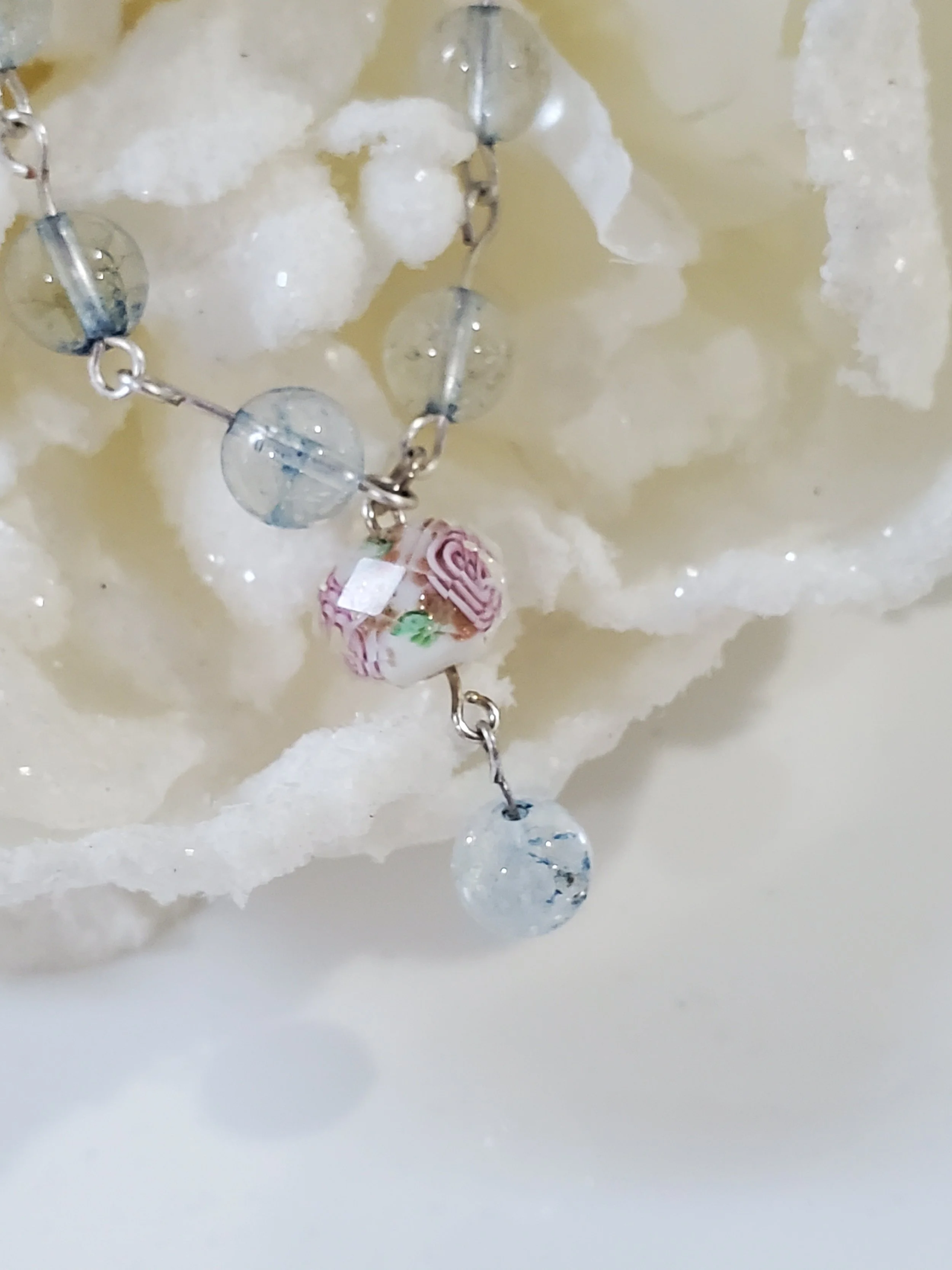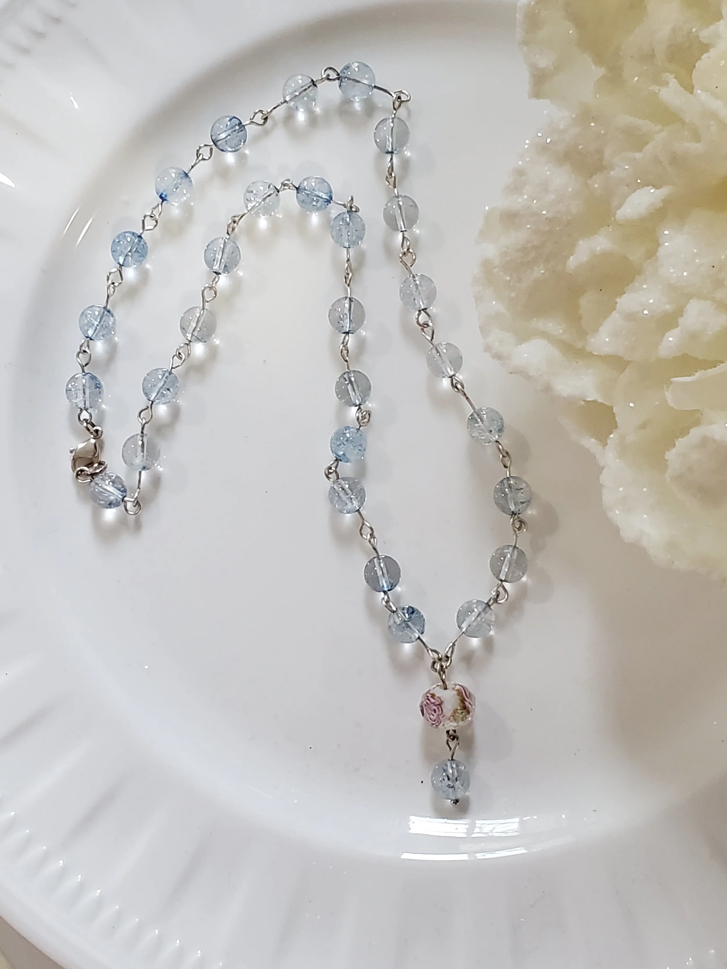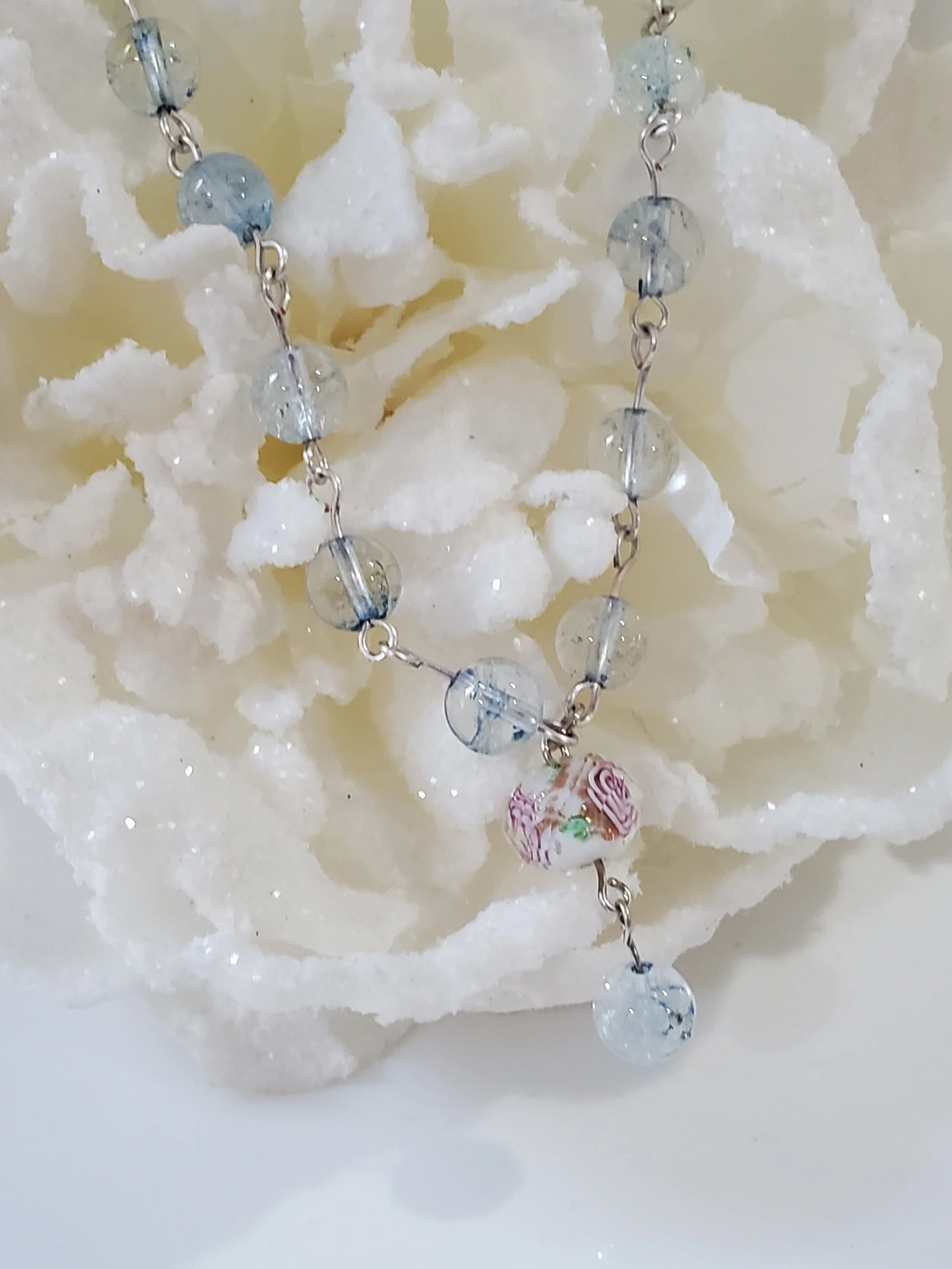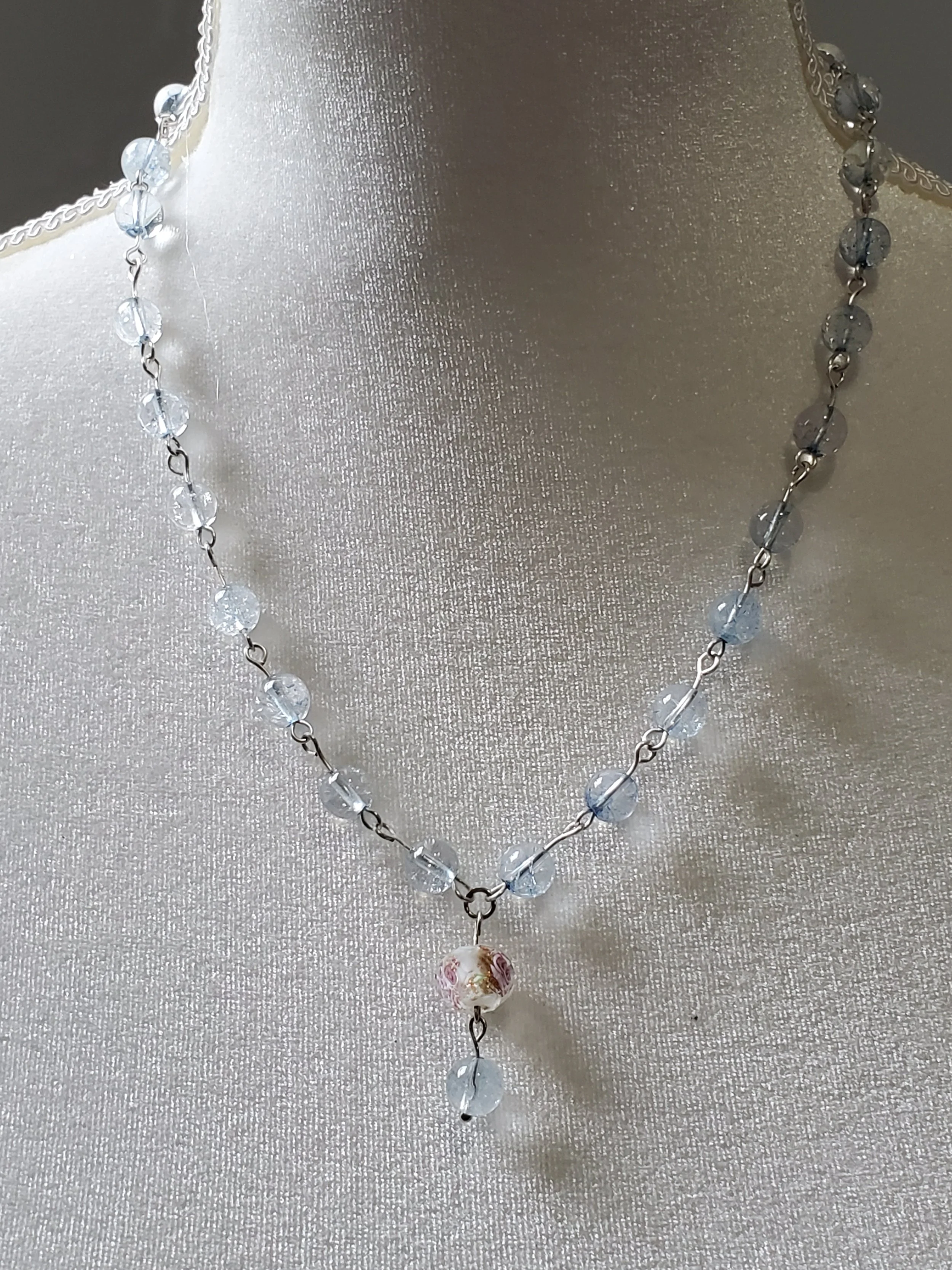 Image 1 of 4 Image 2 of 4 Image 3 of 4 Image 4 of 4 Ariel *NEW* $24.00 8mm light blue zirconia beads on silver plated wire with pink and blue lamp work drop. So sweet and oh so pretty!17"L Add To Cart Added! 8mm light blue zirconia beads on silver plated wire with pink and blue lamp work drop. So sweet and oh so pretty!17"L