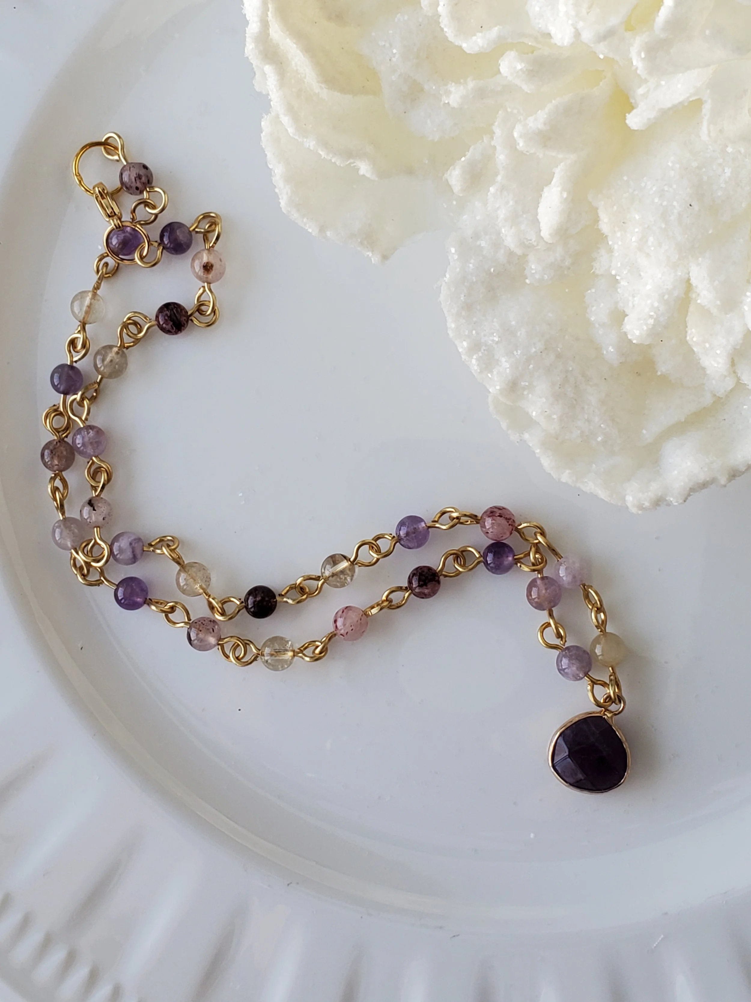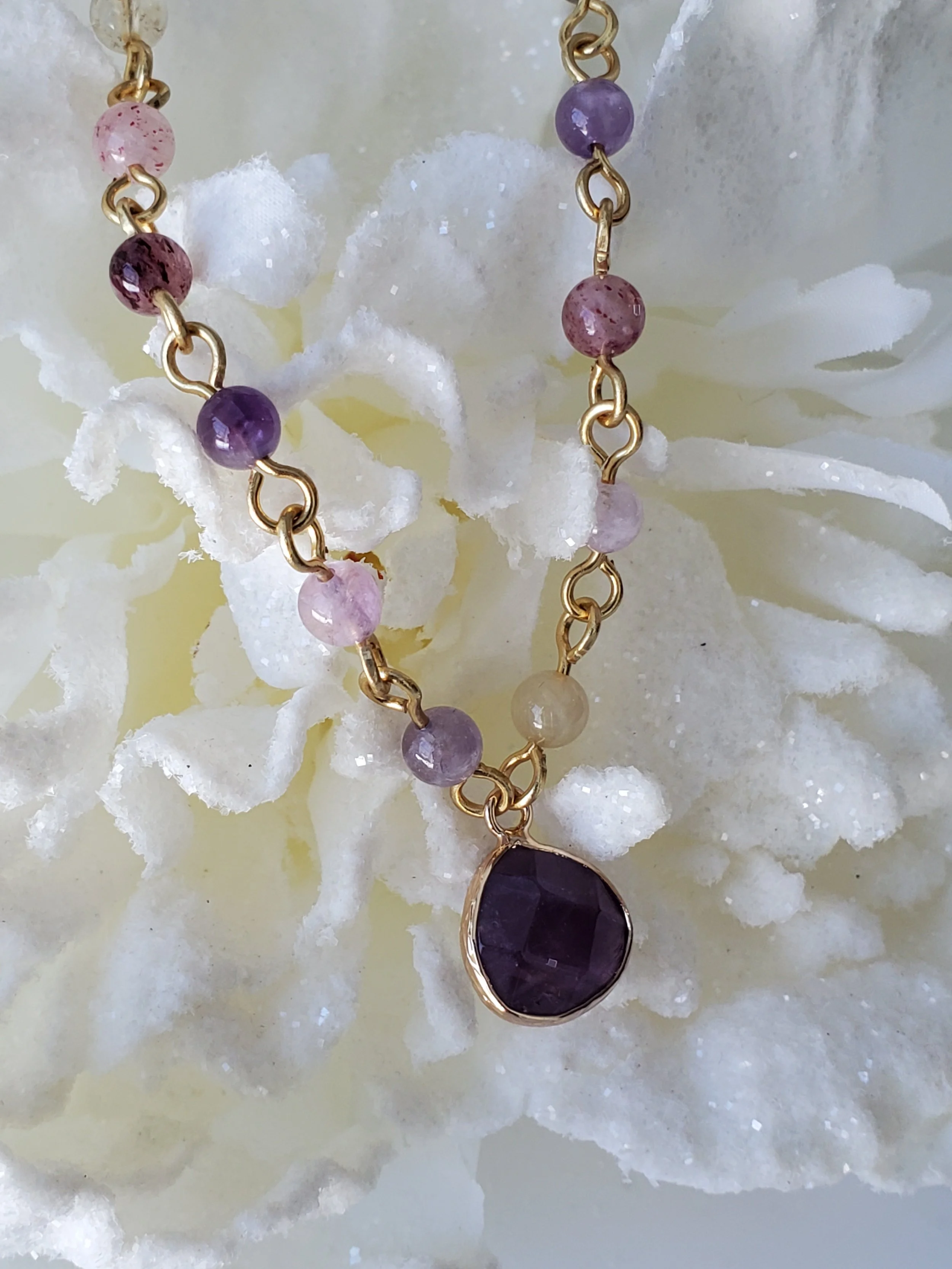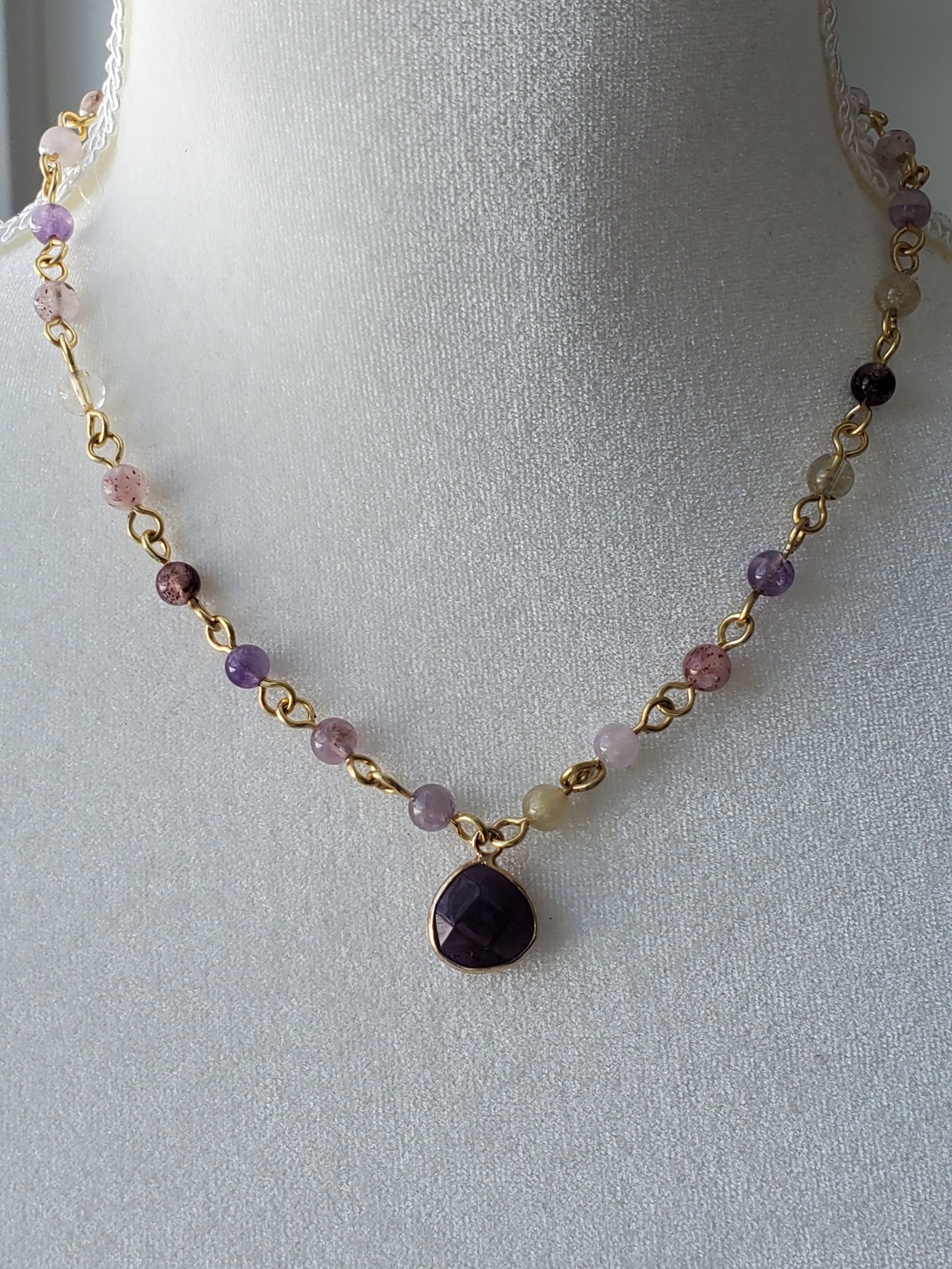 Image 1 of 3 Image 2 of 3 Image 3 of 3 Barb *NEW* $26.00 Small 4mm rainbow fluorite stones in shades of purple, pink, yellow and cream on gold plated wire with amethyst drop.18"L Add To Cart Added! Small 4mm rainbow fluorite stones in shades of purple, pink, yellow and cream on gold plated wire with amethyst drop.18"L