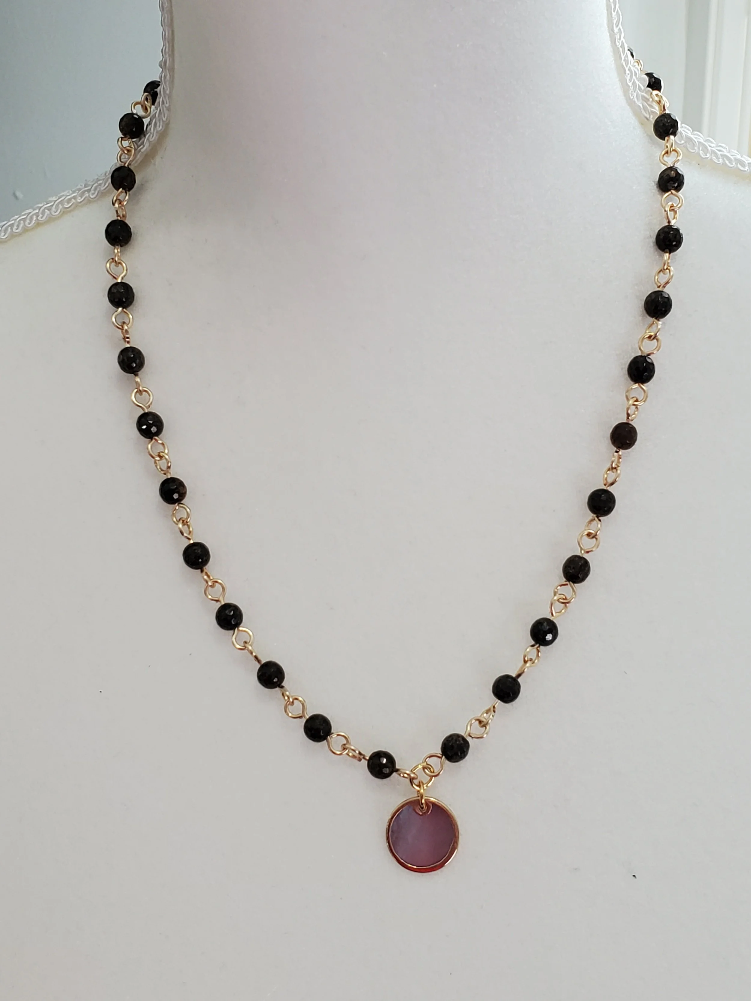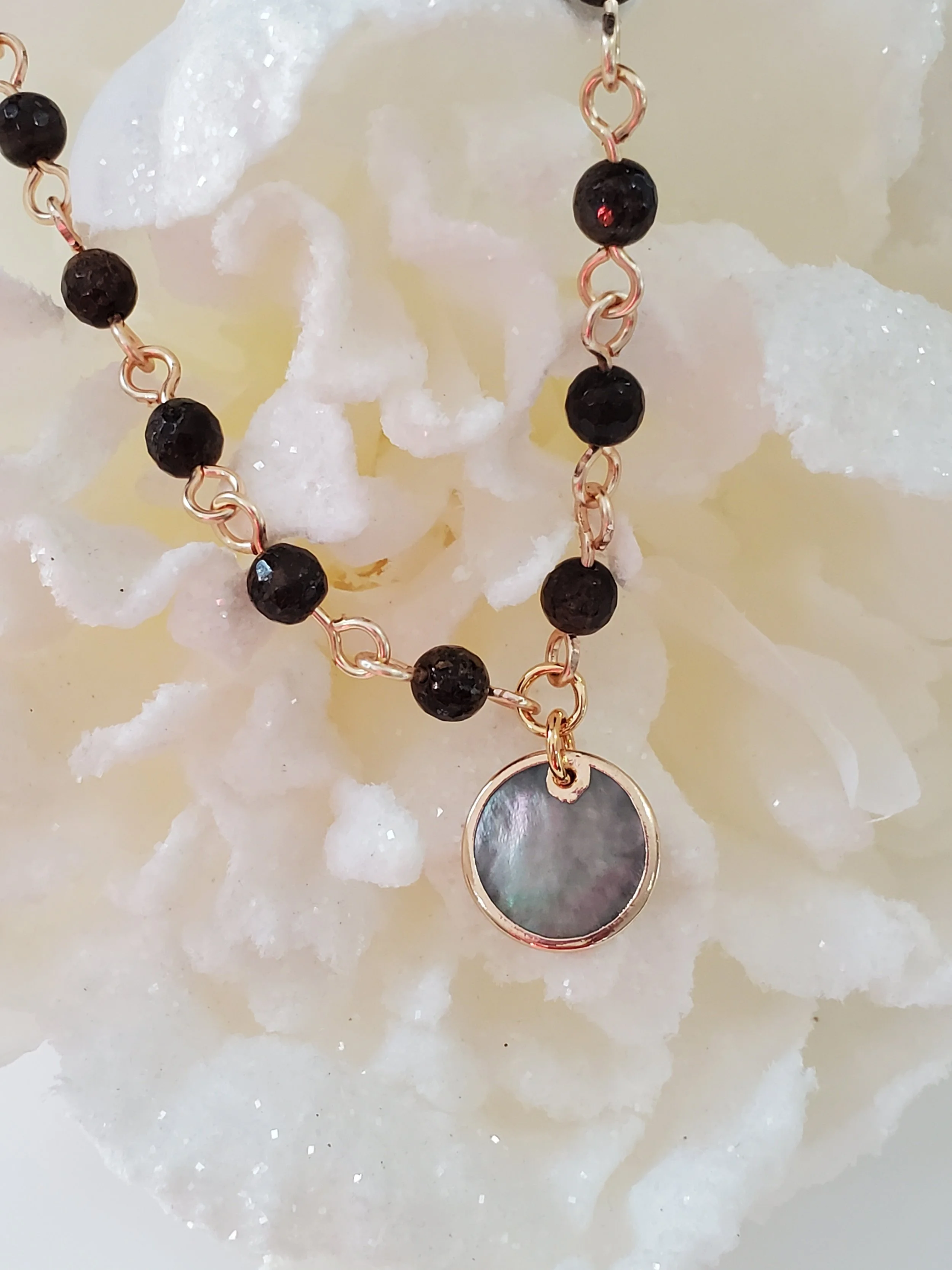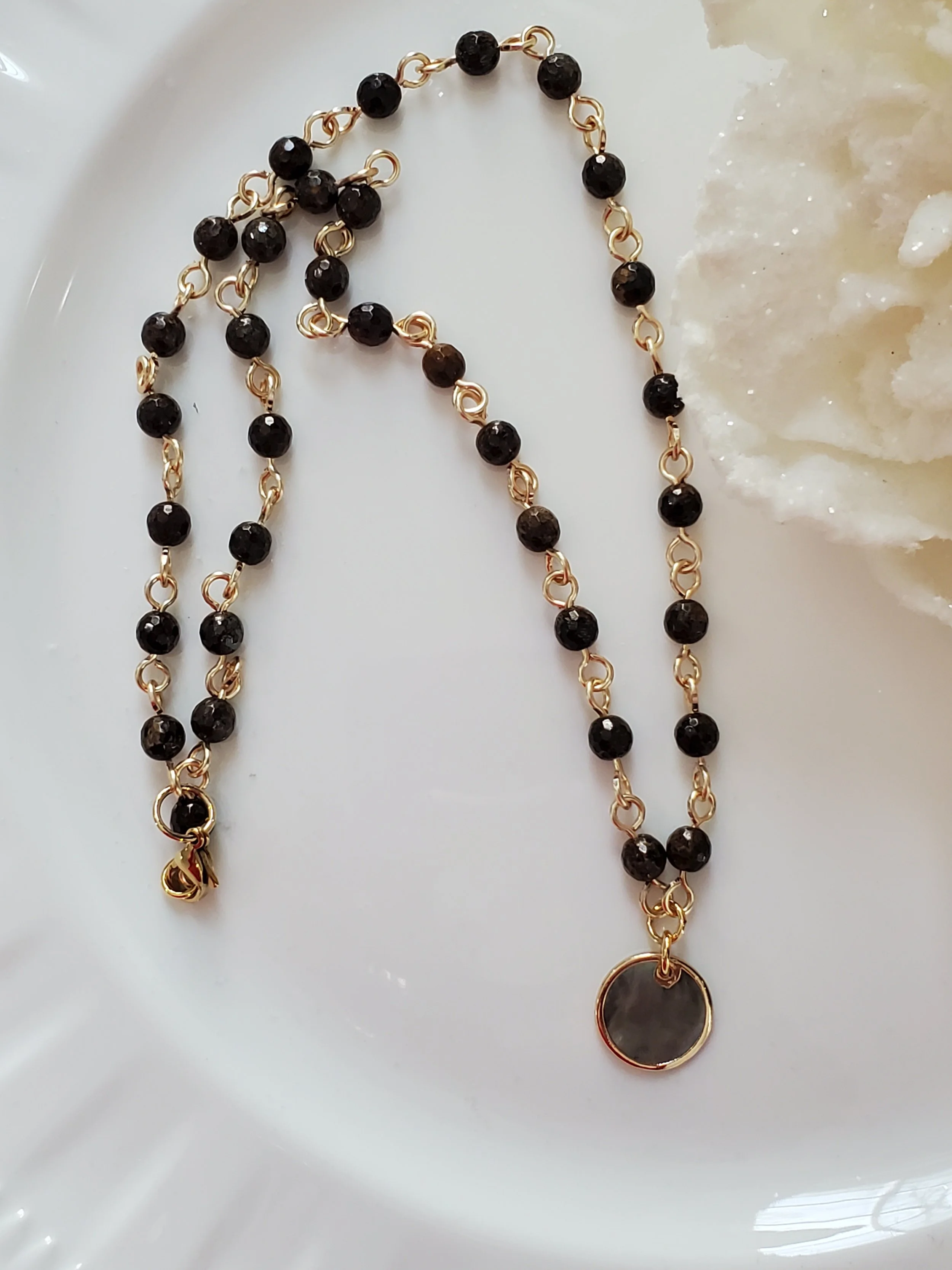 Image 1 of 3 Image 2 of 3 Image 3 of 3 Cheryl *NEW* $26.00 Brown and gold agate stone on gold plated wire with a gorgeous abalone shell circular disc pendant.18"L Add To Cart Added! Brown and gold agate stone on gold plated wire with a gorgeous abalone shell circular disc pendant.18"L