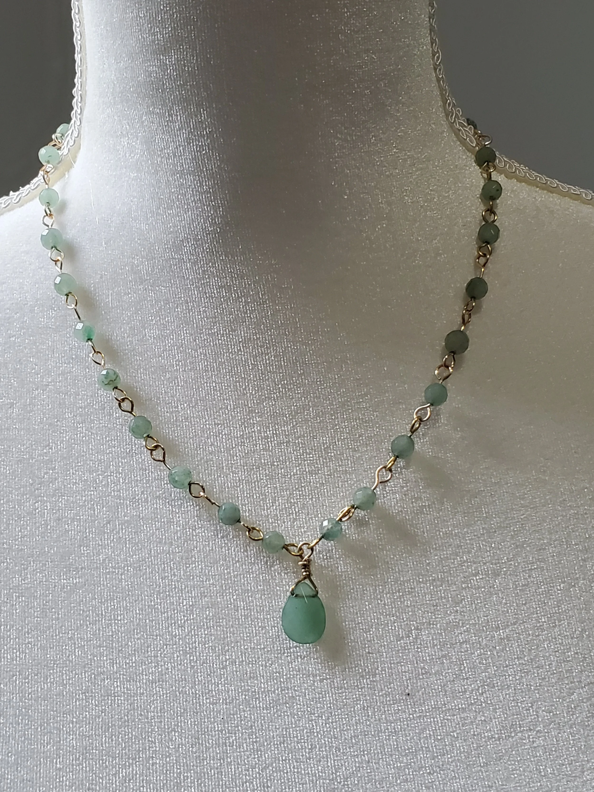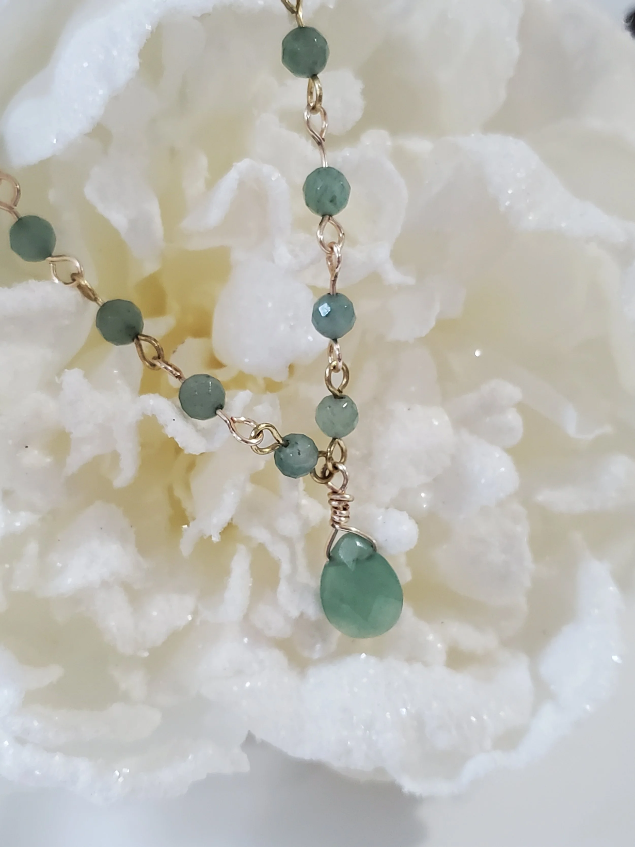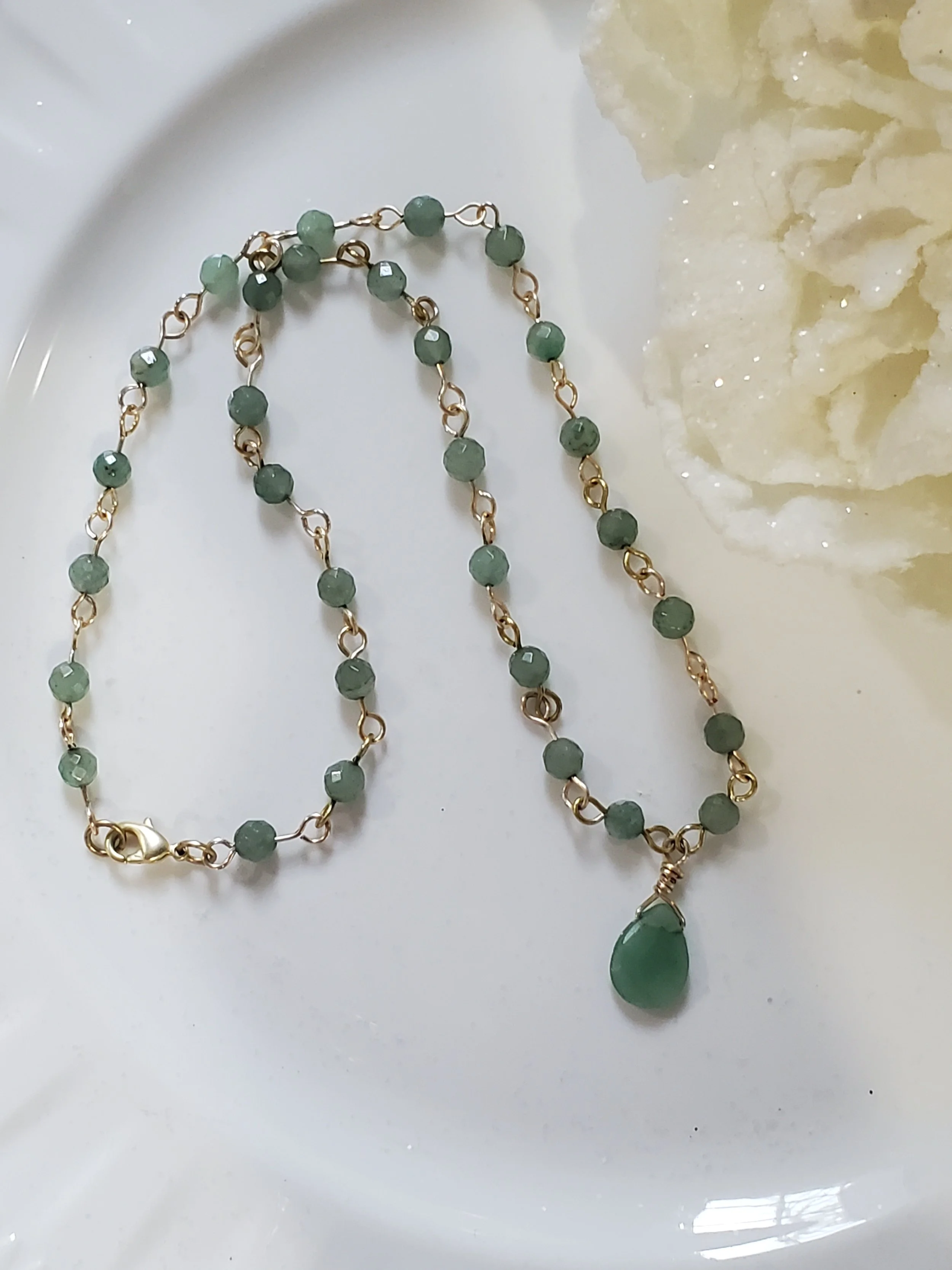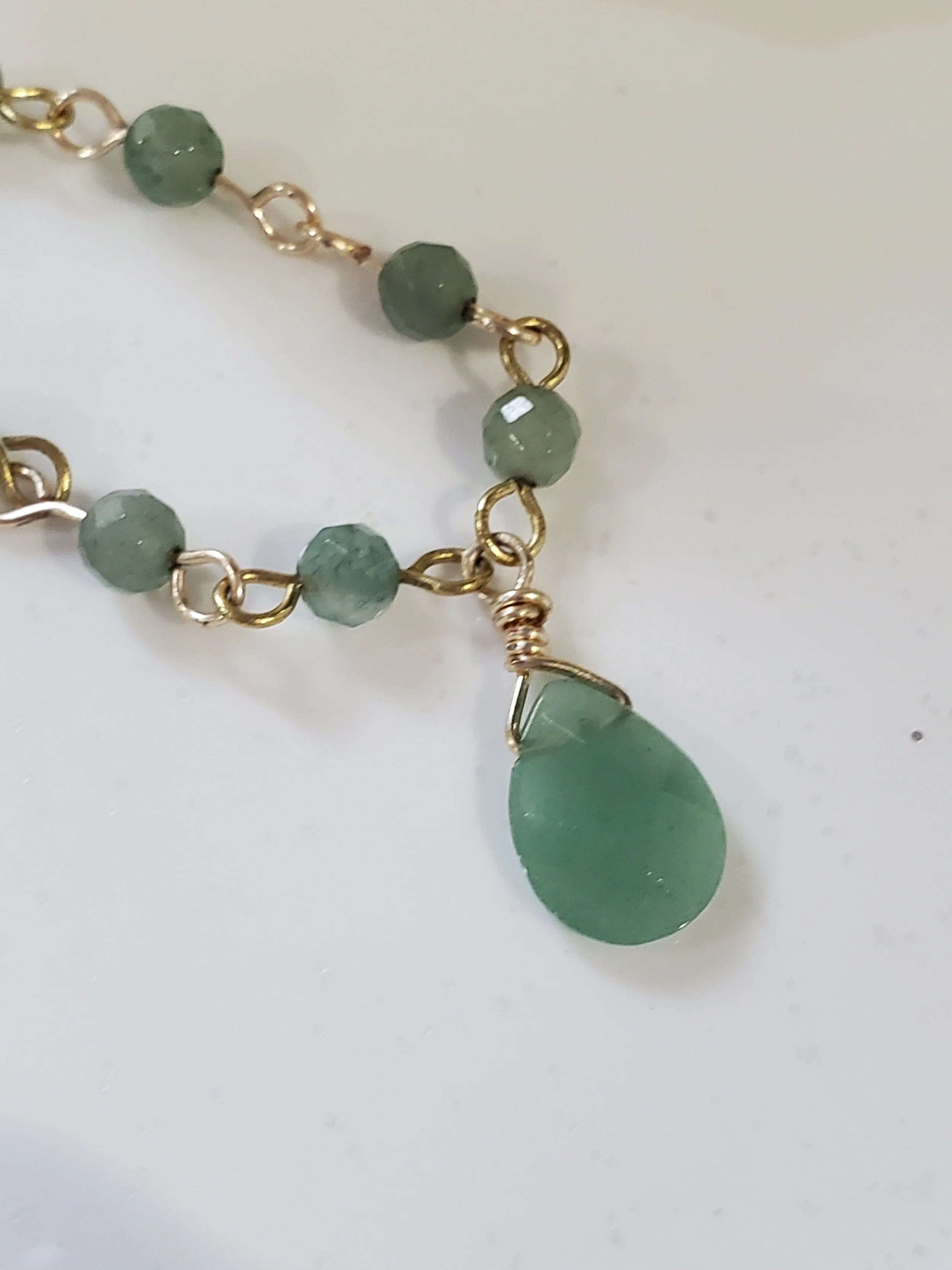 Small green aventurine gemstone beads on gold plated wire with wire wrapped pendant. Great on its own or layer it with a plain gold necklace from your jewelry box.