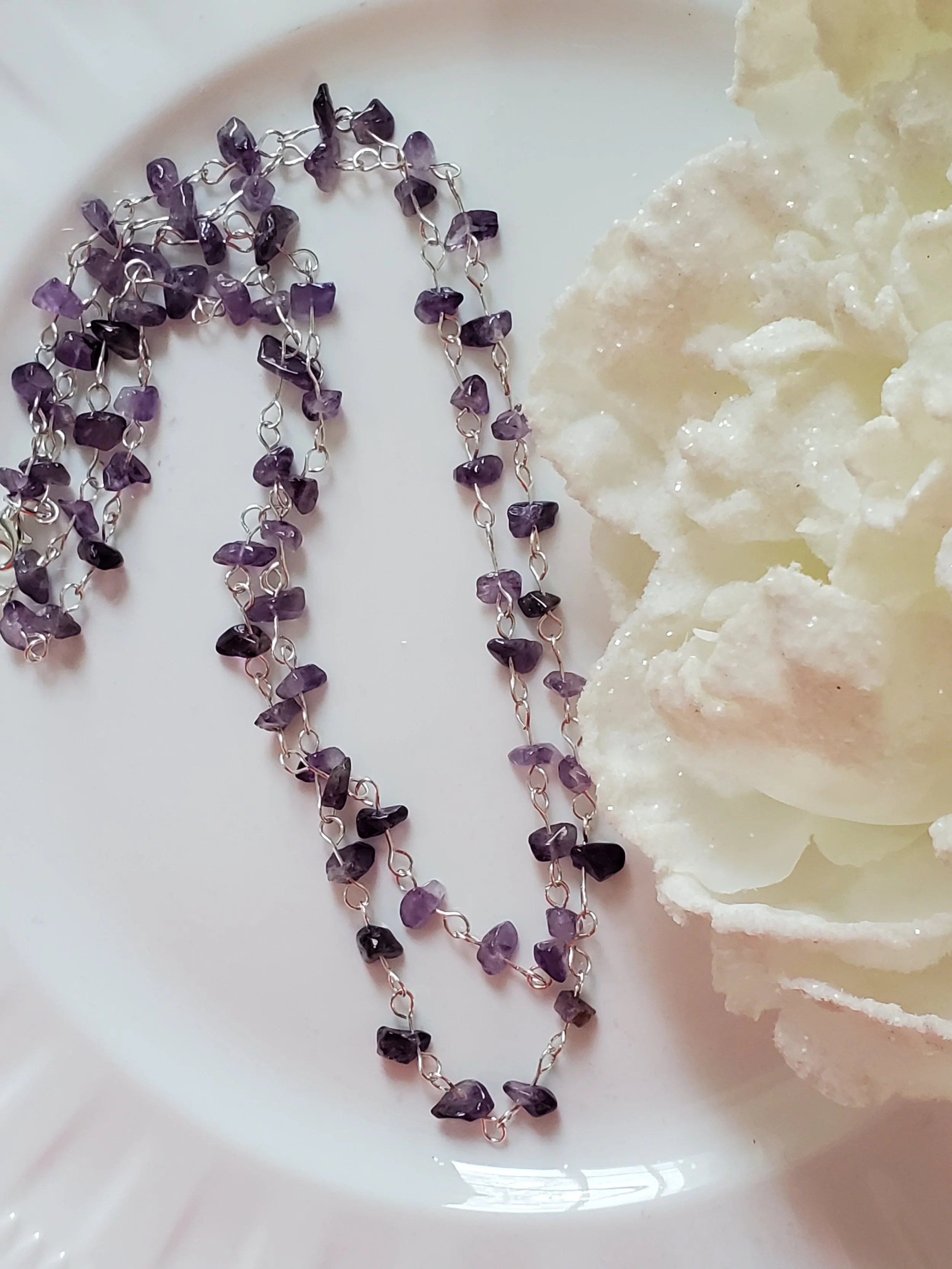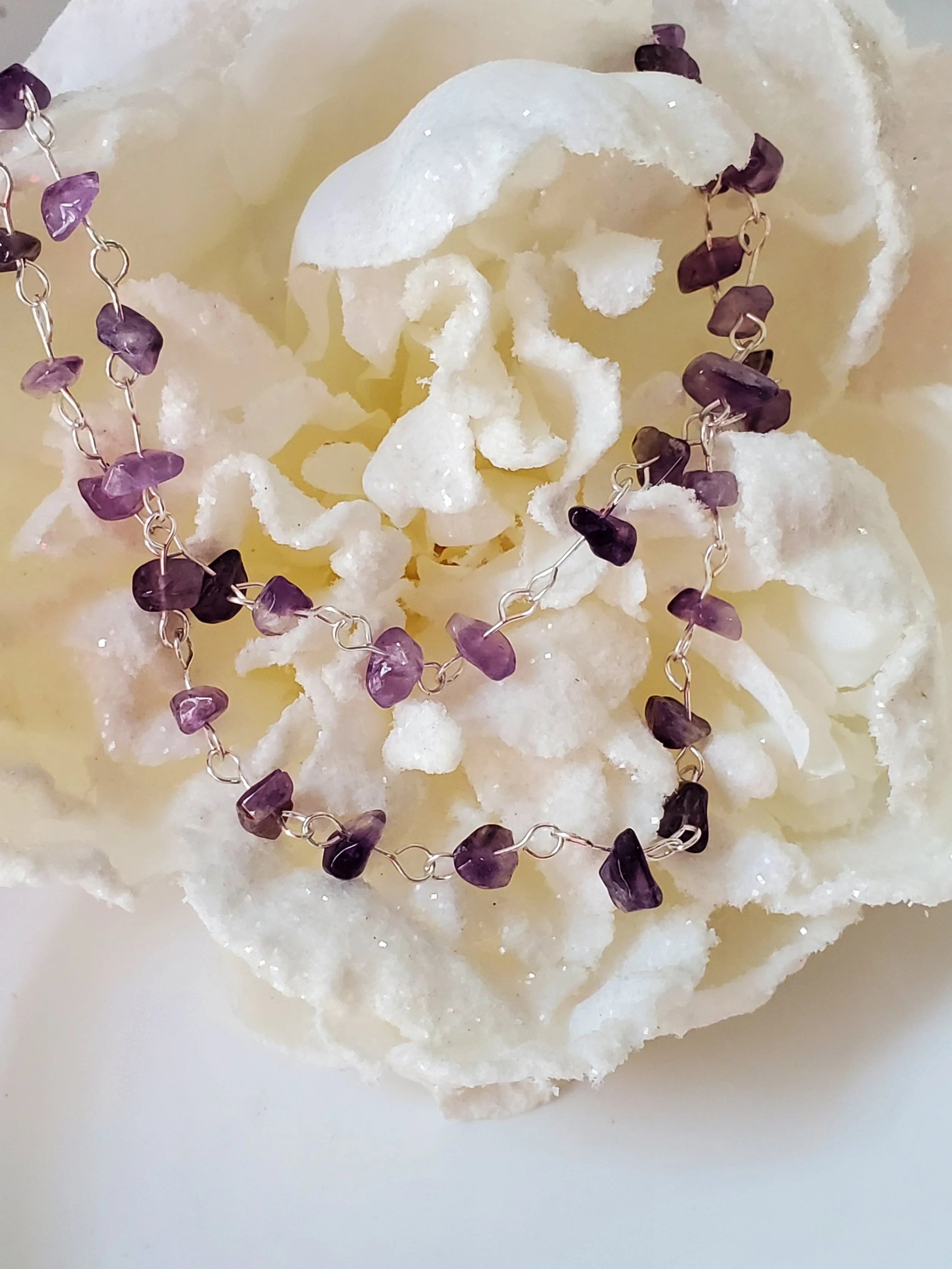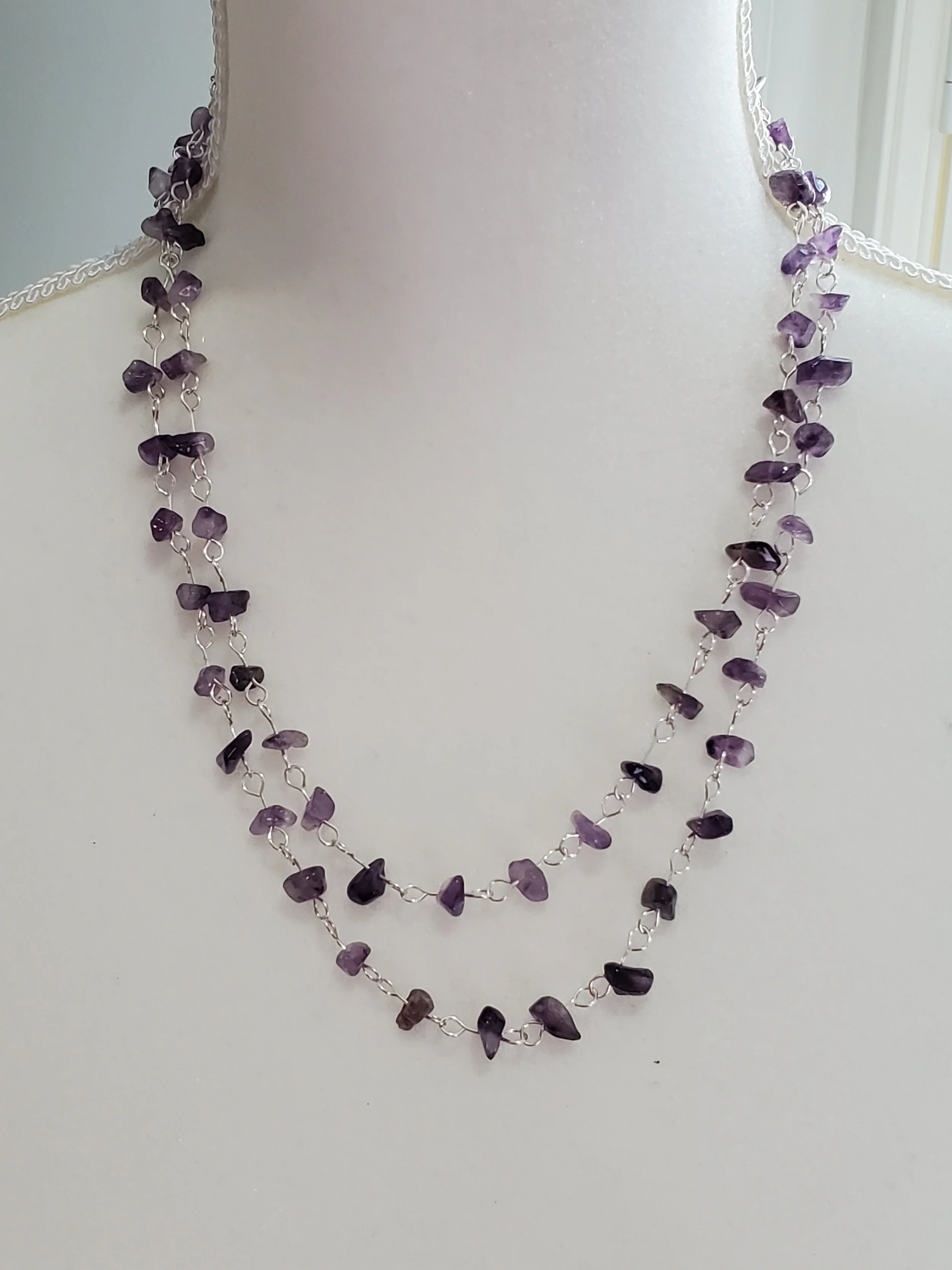 Image 1 of 3 Image 2 of 3 Image 3 of 3 Liz "NEW* $30.00 Double stranded genuine amethyst nuggets on silver plated wire. 20"L Add To Cart Added! Double stranded genuine amethyst nuggets on silver plated wire. 20"L