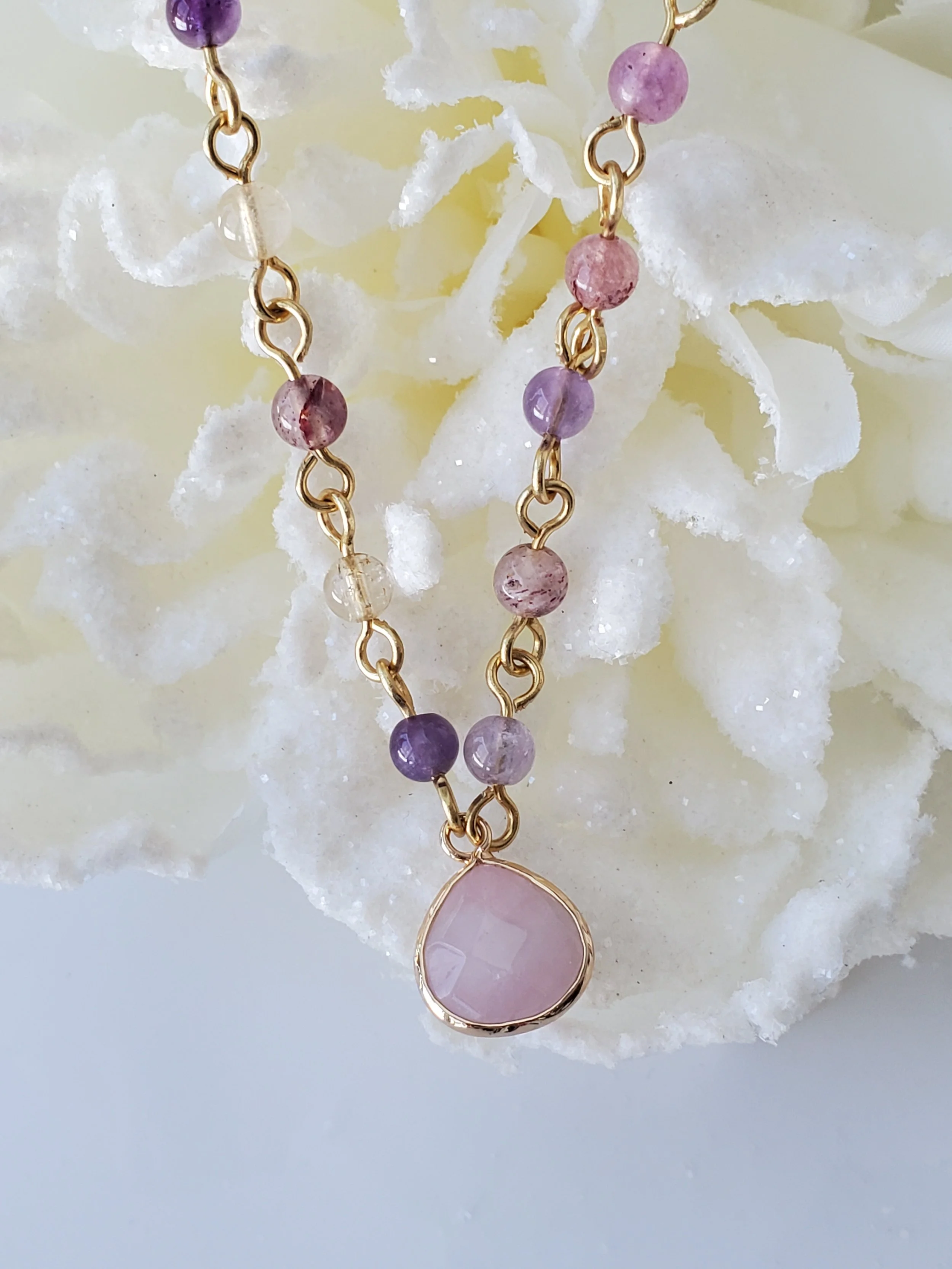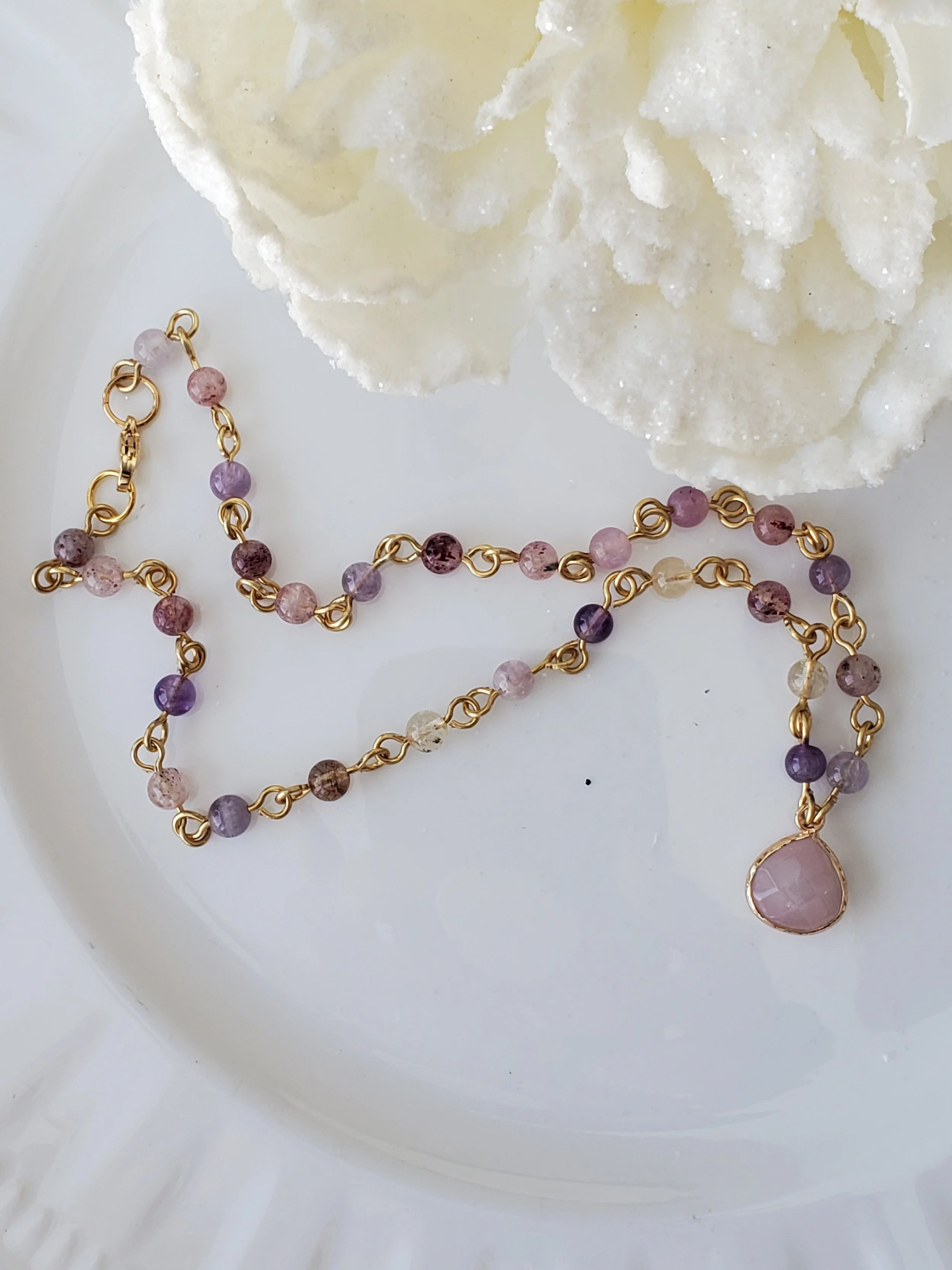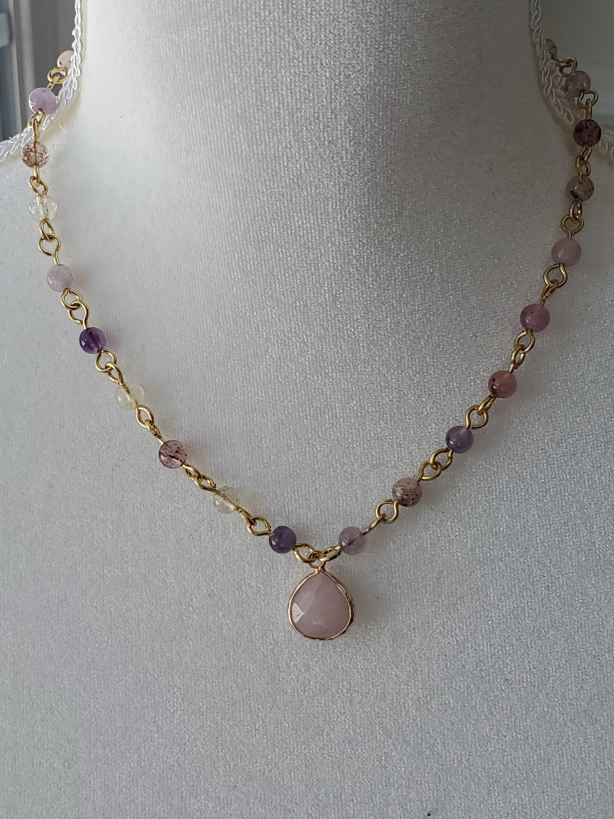 4mm rainbow flourite gemstone beads on gold plated wire with pink moonstone pendant. Perfect spring and summer necklace.