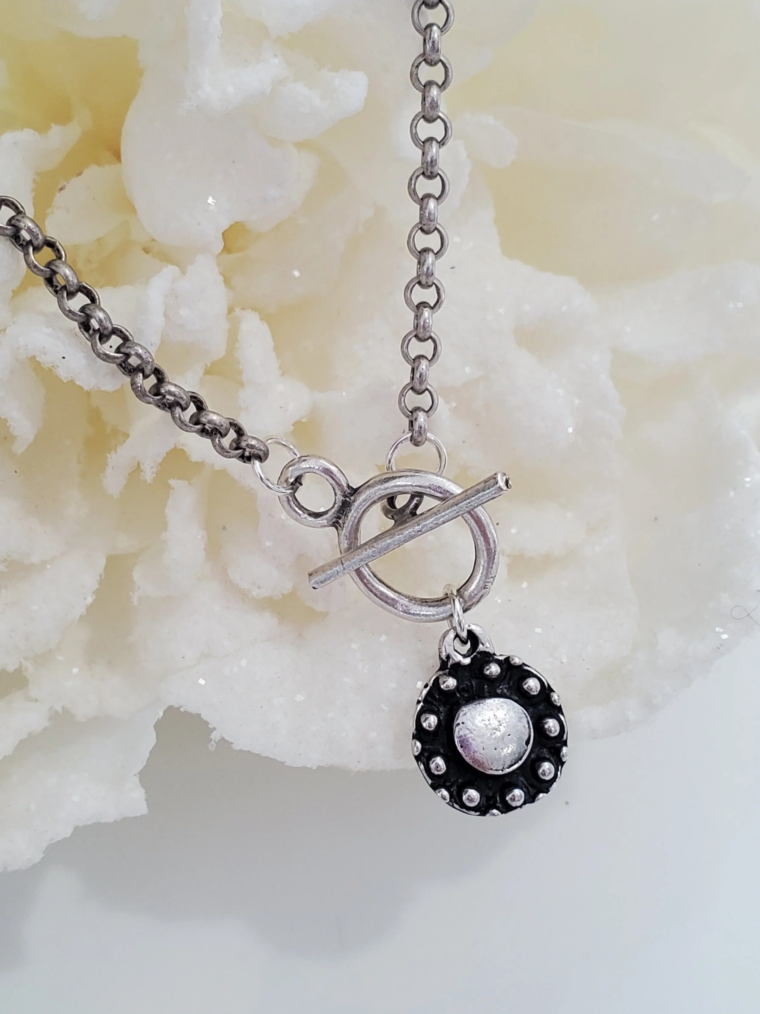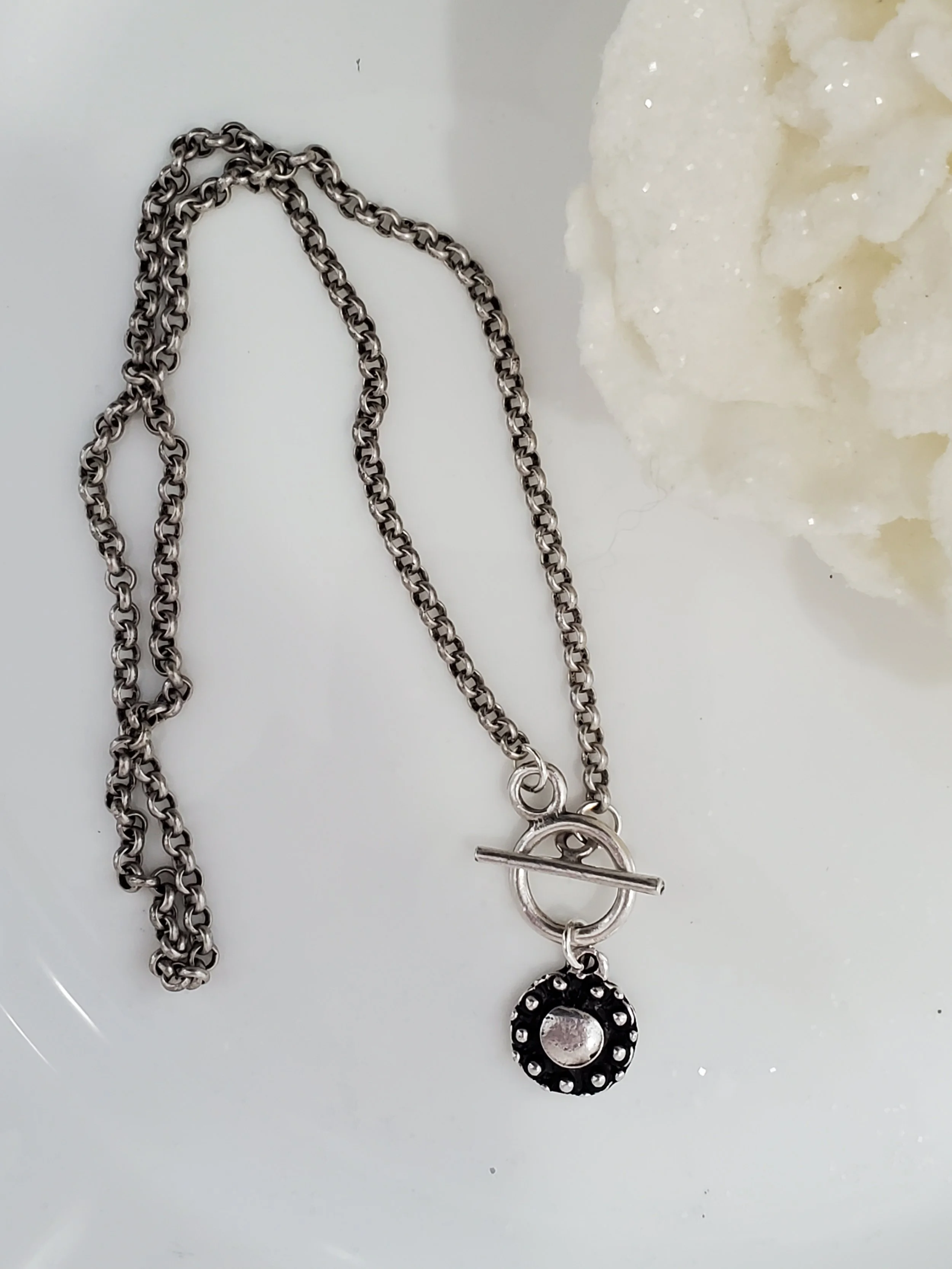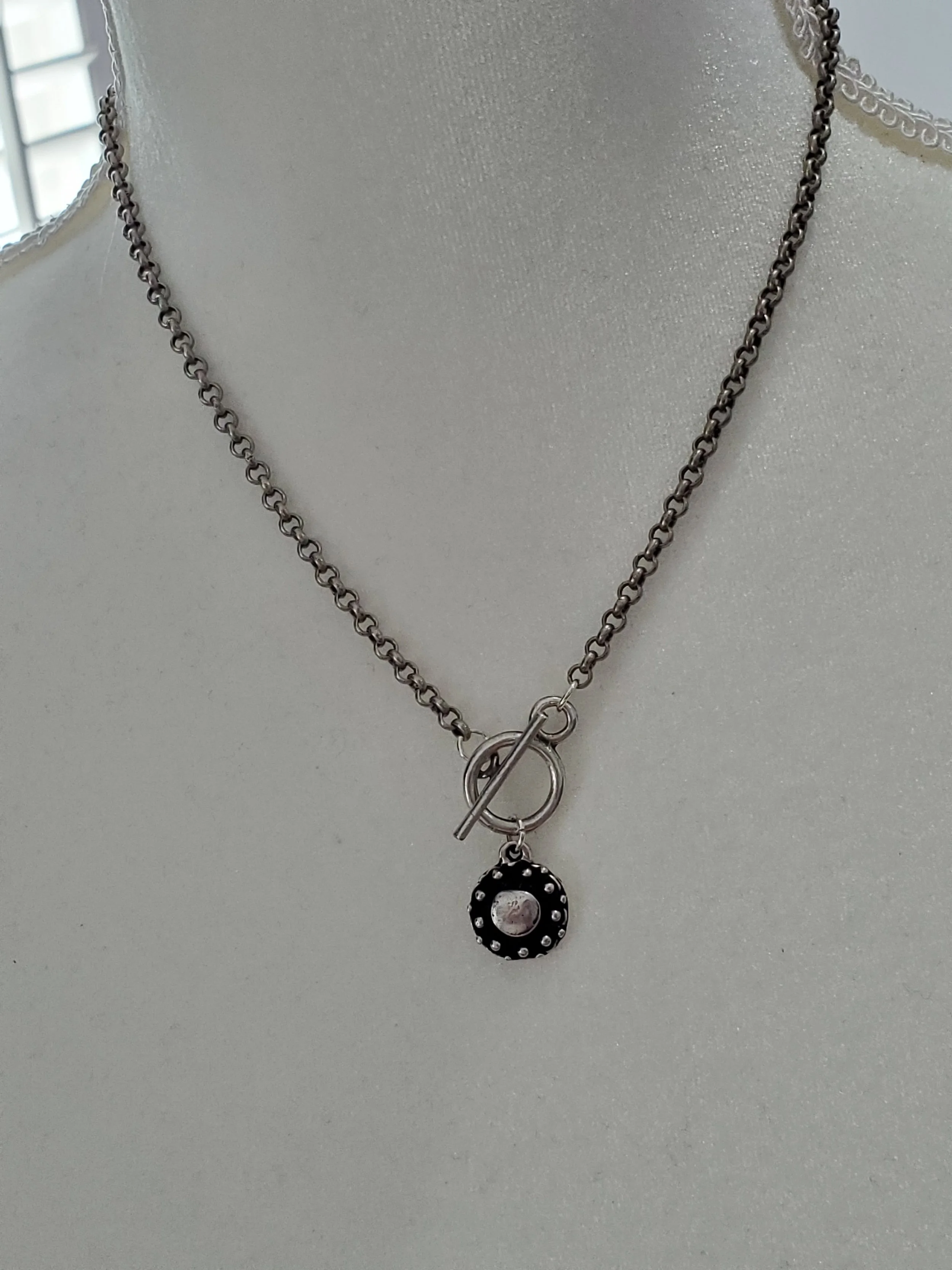Image 1 of 3 Image 2 of 3 Image 3 of 3 Shantal *NEW* $26.00 Antique Silver roll chain with toggle clasp closure adorned with small oxidized antique Silver dotted disc pendant.17"L Add To Cart Added! Antique Silver roll chain with toggle clasp closure adorned with small oxidized antique Silver dotted disc pendant.17"L
