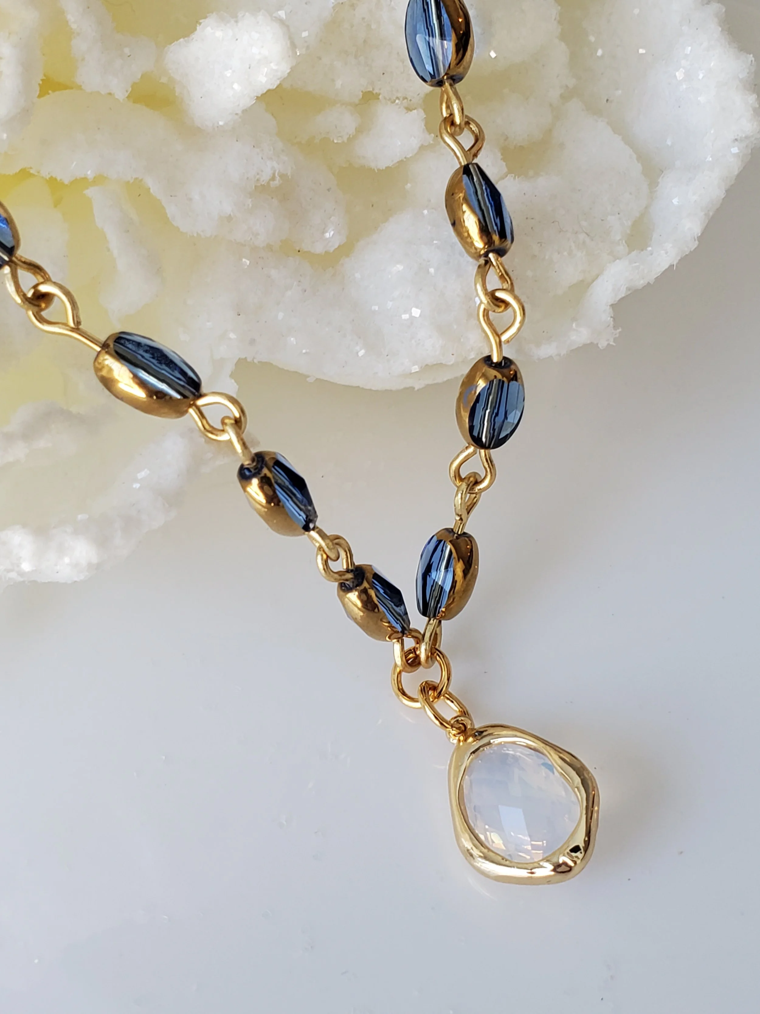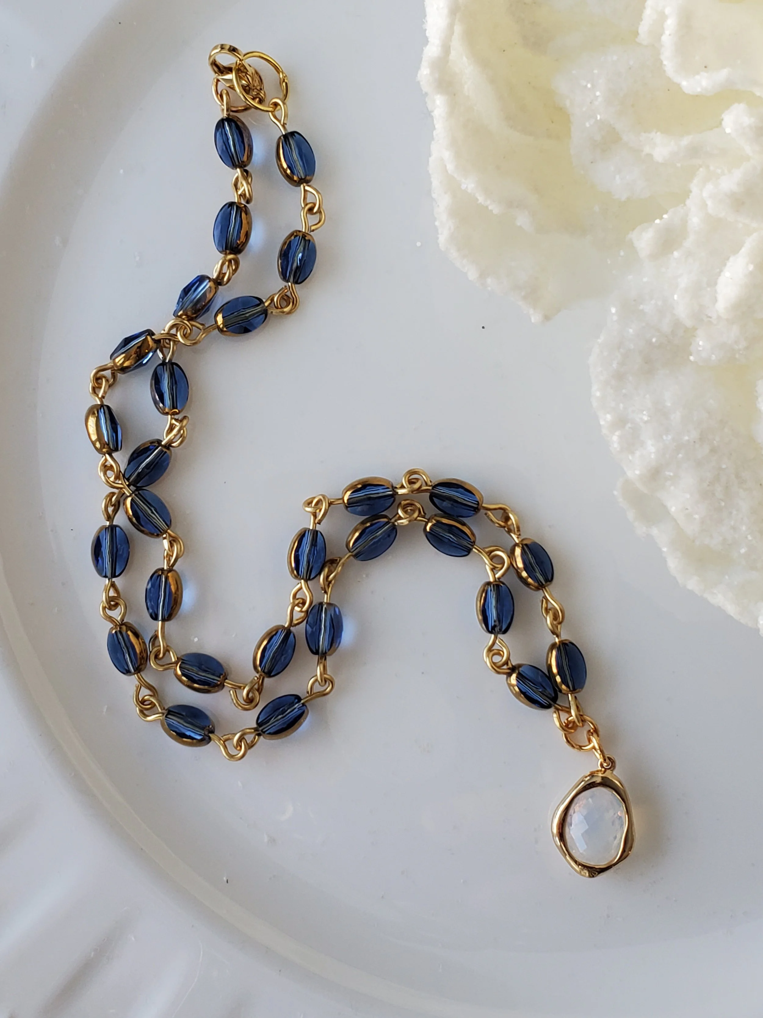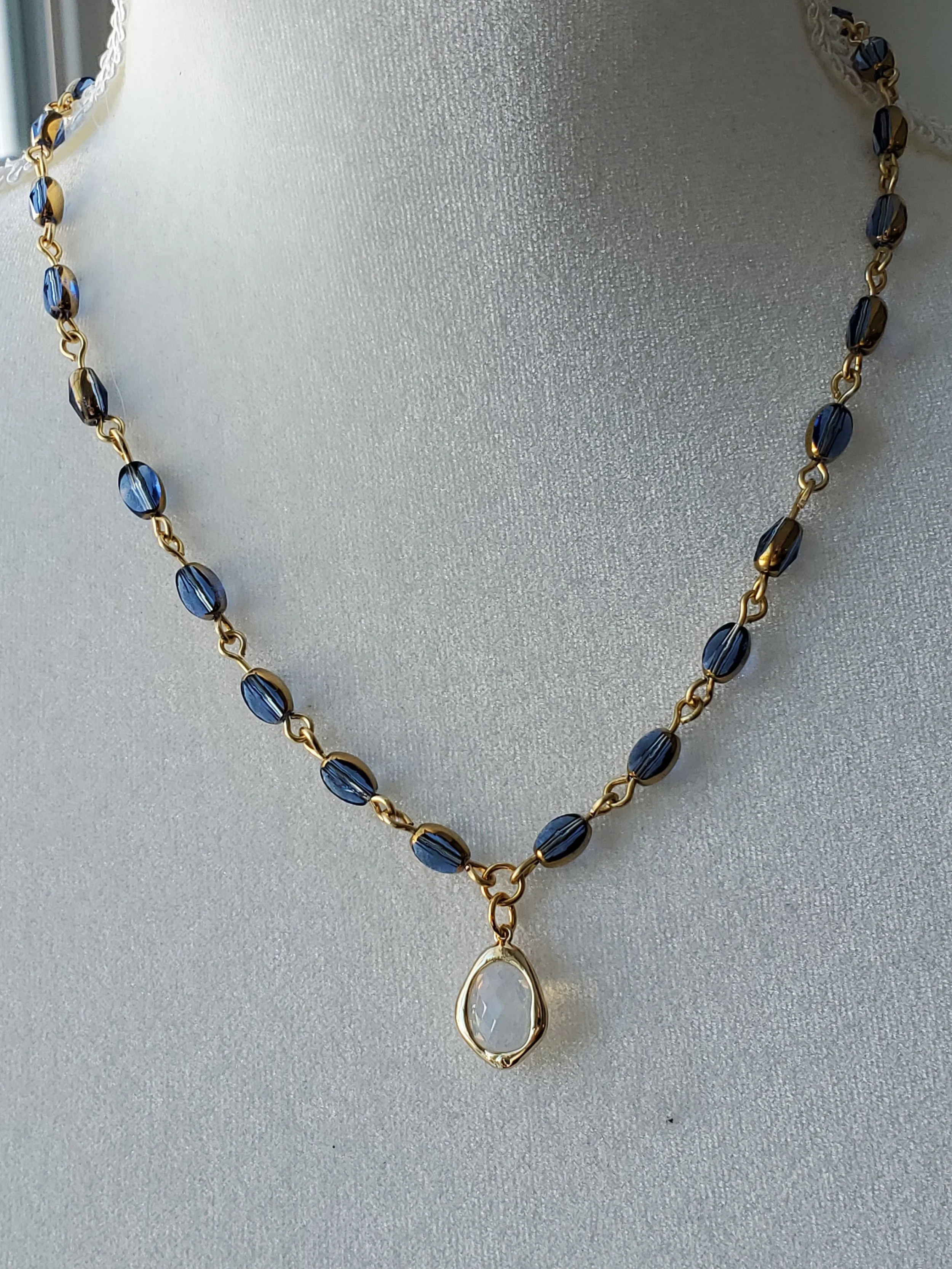 Image 1 of 3 Image 2 of 3 Image 3 of 3 Sophie *NEW* $28.00 Blue with gold edging oval shaped gemstone beads on gold plated wire with crystal iridescent pendant.19"L Add To Cart Added! Blue with gold edging oval shaped gemstone beads on gold plated wire with crystal iridescent pendant.19"L